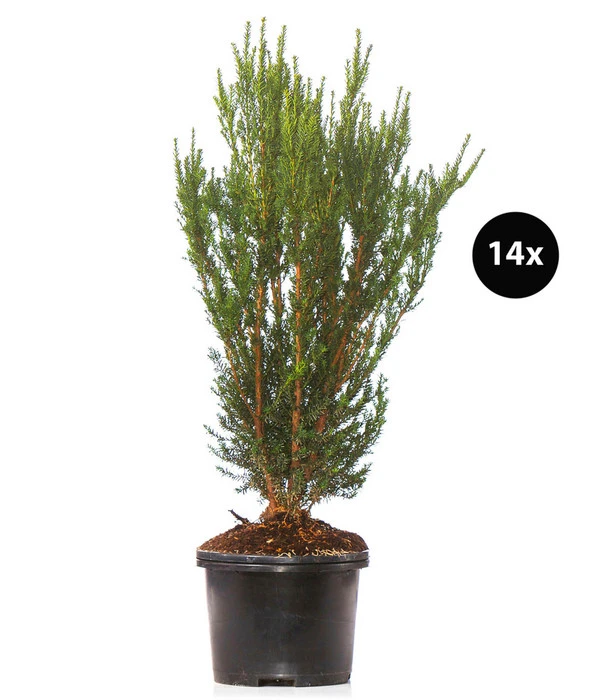 Mit ihrem aufrechten, breit-pyramidalen Wuchs ist die Becher-Eibe ‘Hillii‘ eine der schönsten Heckenpflanzen, die Sie wählen können. Als männliche Pflanze trägt sie zwar keine roten Früchte, überzeugt aber jeden Gärtner mit ihrem deutlich kompakteren Wuchs als die weibliche Variante ‘Hicksii‘, weshalb sie sich besonders gut für wunderschön blickdichte Hecken eignet, die auch aus Ihrem Garten eine ganz private Entspannungs-Insel machen. Eibenpflanzen gehören zwar zu den eher langsam wachsenden Heckenpflanzen, aber im Lauf der Jahre können sie stattliche Wuchshöhen von 300-500 cm erreichen. Das ist Ihnen entschieden zu hoch? Kein Problem: Da sich die Pflanzen ausgezeichnet schneiden lassen, können Sie das Höhenwachstum optimal im Griff behalten. Klingt gut, nicht wahr? Dann packen Sie die Gelegenheit gleich beim Schopf bzw. die 7 Meter Becher-Eibe ‘Hillii‘ in Ihren Warenkorb und schon bald werden sich die Eibenpflanzen bei Ihnen ganz heimisch fühlen und zu wachsen beginnen.