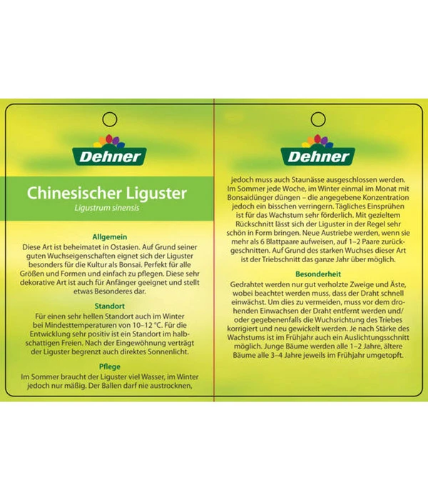 Der beste Standort für den Bonsai im Wohnraum ist hell und nicht zu warm, am besten ist ein Standort an einem Ost- oder Westfenster. Im Sommer darf der Miniaturbaum gerne auf den Balkon oder die Terrasse umziehen, dort sollte aber ein Sonnenschutz gewährleistet sein, da er sich erst langsam an den Standort gewöhnen muss. Achten Sie darauf, dass der Boden nicht austrocknet, sondern stets leicht feucht ist. Denn sonst wird der Chinesische Liguster schnell seine Triebspitzen und Blätter hängen lassen. Gießen Sie den Baum im Sommer am besten alle 2 – 3 Tage, oder Sie stellen den Bonsai samt Schale für 10 Minuten in ein Wasserbad, sodass sich die Erde vollsaugen kann. Lassen Sie die Erde danach gut abtrocknen, denn Staunässe muss unbedingt vermieden werden. Regelmäßiges Besprühen sorgt für eine erhöhte Luftfeuchtigkeit und hält das Blattwerk gesund. Umgetopft wird spätestens nach zwei Jahren, am besten im zeitigen Frühjahr. Durch ausreichende und regelmäßige Düngung – im Sommer etwa zweimal im Monat, über den Winter etwa alle sechs Wochen – fördern Sie das gesunde Wachstum Ihres Bäumchens.