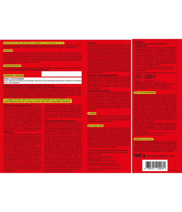 Dieser Wirkstoff wird seit Jahrzehnten mit Erfolg bei der Rattenbekämpfung eingesetzt. Es handelt sich dabei um einen Stoff, den die Tiere mit dem Fraßköder aufnehmen und der die Blutgerinnung verhindert, sodass die Schadnager wenige Tage später an inneren Blutungen sterben. Warum nicht sofort, fragen Sie? Weil Ratten enorm intelligente Tiere sind und „Vorkoster“ vorschicken, um eine neue Nahrungsquelle zu prüfen. Stirbt der „Vorkoster“, werden die übrigen Tiere diese Nahrung – und damit auch den Wirkstoff – nicht aufnehmen. Deshalb wirkt Brumolin® Ultra Rattenköder zeitversetzt, sodass Sie damit effektiv gegen die Ratten innerhalb und außerhalb des Hauses vorgehen können.