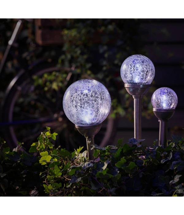 Vielleicht haben Sie schon beobachtet, wie in einigen Gärten abends hübsche Kugeln zu leuchten beginnen und für reizvolle Effekte an verschiedenen Stellen im Garten sorgen. Und vielleicht haben sich sogar vorgestellt, an welchen Stellen im Garten Sie selbst eine oder mehrere dieser hübschen Kugelleuchten platzieren könnten? Dann zögern Sie nicht länger und lassen auch Sie Ihren Outdoor-Bereich am Abend in ganz neuem Licht erstrahlen! Mit dieser Dehner Solar-Glaskugel! Denn diese Außenlampe entfaltet ihren dekorativen Reiz nicht nur im Dunkeln, sie ist schon bei Tag ein kleines Schmuckstück. Auf einem schlichten Metallstab ruht eine Glaskugel, deren Oberfläche einen edlen Krakelee-Effekt zeigt. Als Krakelee bezeichnet man die leicht rissig wirkende Oberfläche, die hier nicht Folge hohen Alters ist wie bei vielen Antiquitäten, sondern ein dekorativer Kunstgriff, der die Dehner Solar-Glaskugel zu einem Hingucker in der Gartenanlage macht.