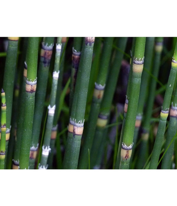 Die schlanken, blattlosen Stängel des Japanischen Schachtelhalms sind ein besonders dekorativer Schmuck am Teich. Sie sind dezent grün-braun gestreift und können eine Höhe von 150 cm erreichen. Die Heimat des Schachtelhalms sind Teichufer, Bachläufe und Sumpfgärten und so wird sich die Pflanze auch in Ihrem Teich am wohlsten in einer Wassertiefe bis 30 cm fühlen. Von Juli bis August bilden sich ansehnliche, braune Blüten, die den Dekorationswert noch erhöhen. Schachtelhalme gab es übrigens schon in grauer Vorzeit. Vor ca. 250 Millionen Jahren bildeten die Vorfahren dieses Schachtelhalms ganze Wälder mit bis zu 30 m hohen Bäumen.