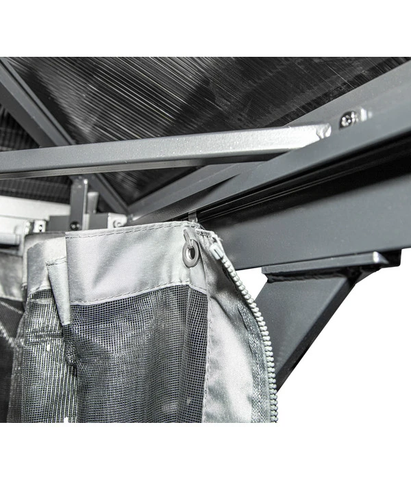 Im Lieferumfang zum Sojag Pavillon Verona sind nicht nur passende Moskitonetze enthalten, sondern auch zweigleisige Laufschienen, sodass Sie zusätzlich Vorhänge anbringen können. Diese sind in edlem Anthrazit als Zubehör erhältlich. Das Besondere an diesem Pavillonmodell: Sie können die Vorhänge und die Moskitonetze gleichzeitig benützen.