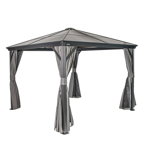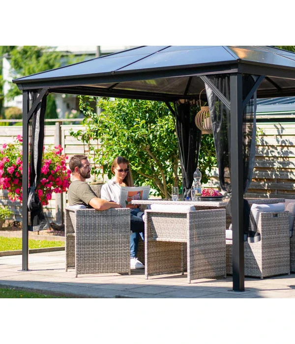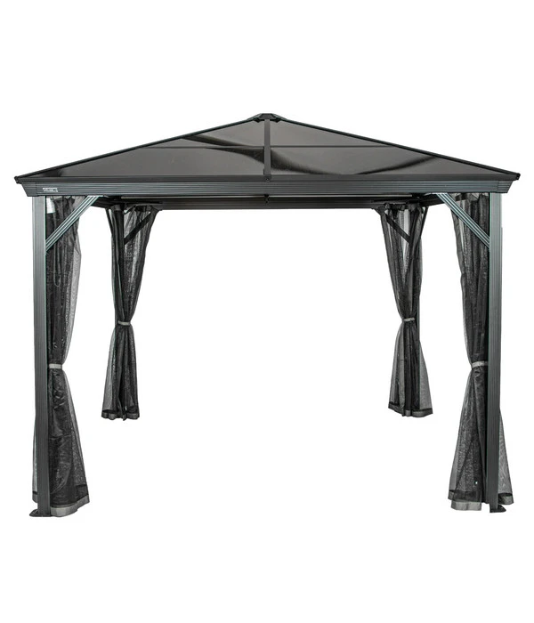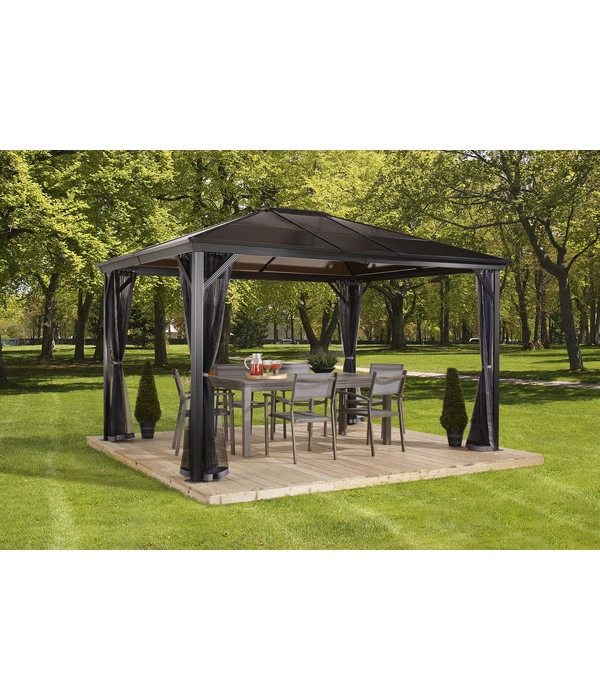 Kennen Sie schon Ihre neue Sommer-Residenz? Das Lieblingsplätzchen, das die Familie gerne aufsucht, um gemütliche Stunden im Freien zu verbringen und um das Ihre Freunde Sie ein kleines bisschen beneiden? Richtig, es ist der Sojag Pavillon Verona! An diesem lauschigen Plätzchen können Sie morgens gemütlich frühstücken, sich während der Mittagsstunden vor Sonne und Hitze schützen und abends bis in die Nacht hinein plaudern, lesen, träumen oder zünftig feiern. Und wenn bei Einbruch der Dämmerung hungrige Insekten über Sie herfallen wollen, ziehen Sie einfach die Moskitonetze aus Nylon zu und lassen sich in Ihrem Vergnügen nicht stören. Doch der Pavillon ist nicht nur ein Profi in puncto Funktionalität, der Sie vor UV-Strahlen, Hitze und Regen schützt, er ist auch ein exquisiter Blickfang im Garten. Genießen Sie das edle Design wie die Qualität vom größten und bekanntesten kanadischen Pavillon-Produzenten: den Sojag Pavillon Verona!