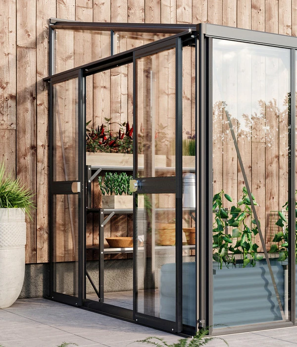 Sie haben sich zum Schutz Ihrer Pflanzen für das Anlehngewächshaus Athene entschieden und wollen es noch zusätzlich aufwerten? Dann ist das Doppeltür-Kit Athene von Vitavia genau das Richtige für Sie! Es ist sowohl an der Front als auch an den Seiten der Athene-Konstruktion montierbar. Als perfekte Ergänzung zur Schiebetür können Sie Ihr Gewächshaus so von unterschiedlichen Seiten betreten. Das ist besonders praktisch, wenn Sie Ihre Pflanzen zur kalten Jahreszeit von unterschiedlichen Orten Ihres Gartens in ihr schützendes Winterdomizil tragen wollen. Gönnen Sie sich diesen Extra-Komfort für Ihre kleine grüne Oase.