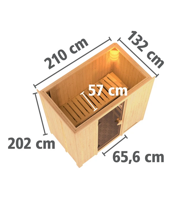 Die vorgefertigten Wände der Wolff Finnhaus Innensauna de luxe Diona haben eine stattliche Stärke von 68 mm und bestehen aus Fichtenholz inklusive einer zusätzlichen Dämmung aus Mineralwolle. Auch die vormontierte Decke ist mit Mineralwolle gedämmt, damit die Wärme in der Saunakabine bleibt. Dank eines einfachen Steck- und Schraubsystems ist der Aufbau der Wolff Finnhaus Innensauna de luxe Diona ein Kinderspiel. Im Inneren erwartet Sie eine Saunabank aus massivem Espenholz. Diese Pappelart zeichnet sich durch eine besonders feine, glatte Oberfläche aus, die Sie gut reinigen können und die nicht unangenehm heiß wird, wenn Sie sich beim Saunieren darauf ausstrecken. Komplett wird die hochwertige Ausstattung der Sauna durch den Dachkranz, zu dem ein LED-Strahlerset mit 3 frei positionierbaren 7,5 Watt-Strahlern gehört.